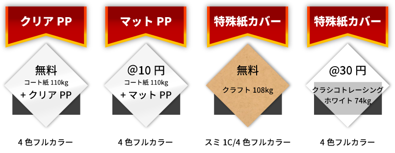 | クリアPPカバー | マットPPカバー | クラフトカバー | トレペカバー |