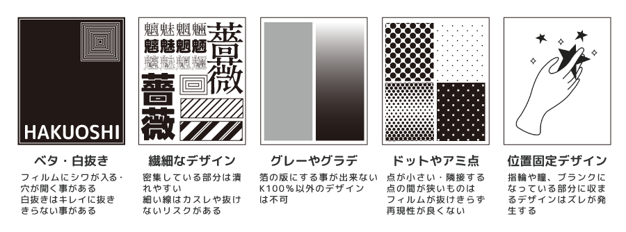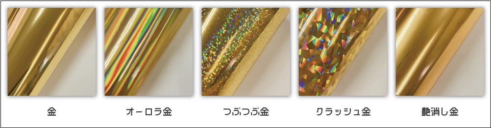 ホログラム箔(オーロラ金・つぶつぶ金・クラッシュ金)はパターンのつなぎ目があり、境目が仕上がりに入る場合があります。