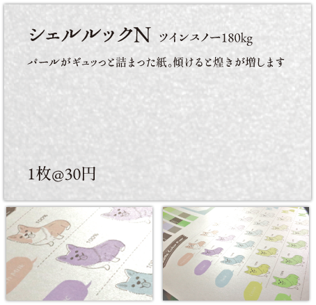 パールの粒子がぎゅっと詰まった華やかな用紙。スフレカラーの印刷箇所がマットになり、対比が楽しい。